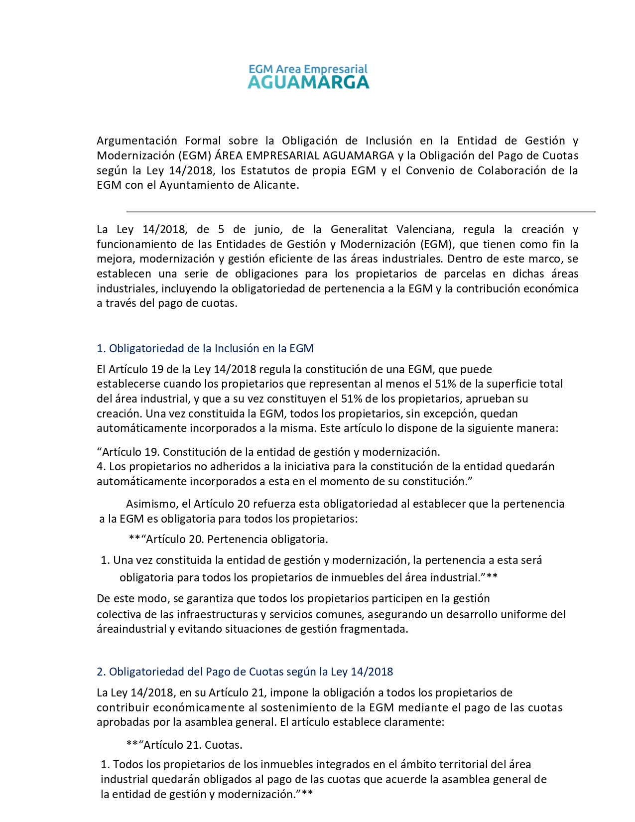 “Argumentación formal sobre la obligación de inclusión en la EGM Área Empresarial Aguamarga y la obligación del pago de cuotas según la Ley 14/2018, los Estatutos de la EGM y el Convenio de colaboración con el Ayuntamiento de Alicante”.