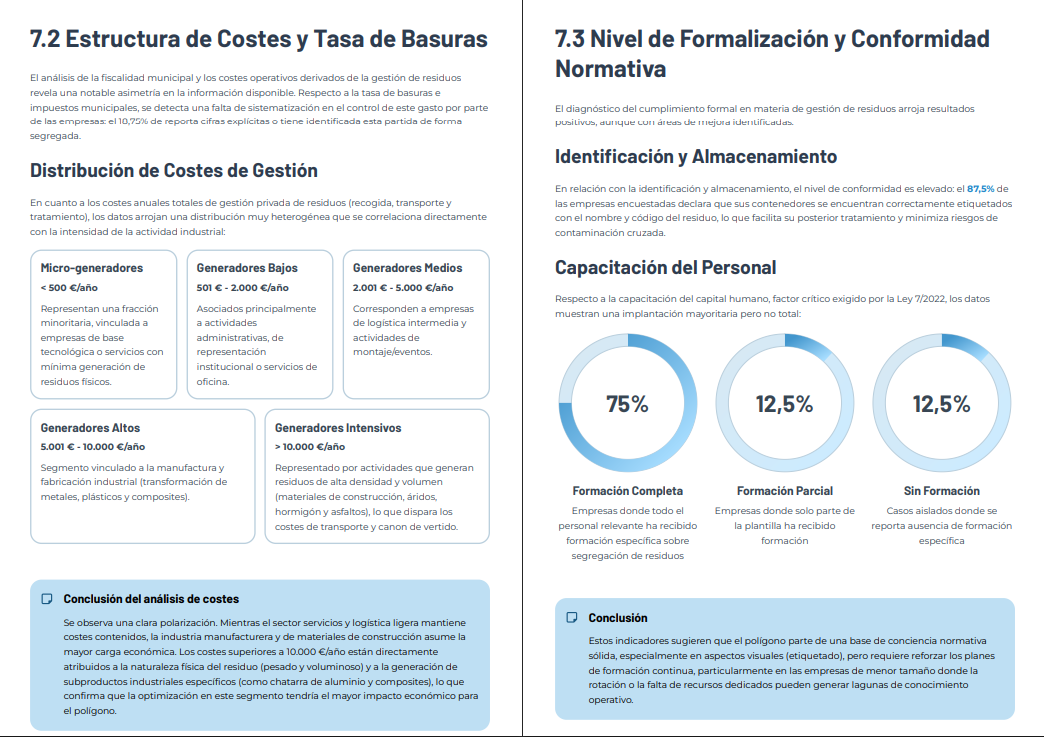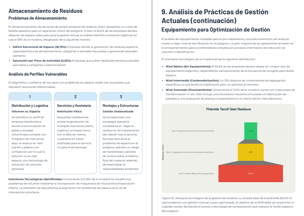 Es un diagnóstico de la gestión de residuos en el Polígono Industrial Aguamarga a partir de datos de 16 empresas: describe qué tipos de residuos generan (universales, peligrosos, metales, RCD, RAEE, etc.), en qué cantidades, cómo los separan y almacenan, qué sistemas de recogida utilizan, qué tecnologías de compactación o tratamiento tienen, y qué costes e ingresos les supone actualmente la gestión de esos residuos, diferenciando entre sectores como servicios, logística, manufactura y construcción.