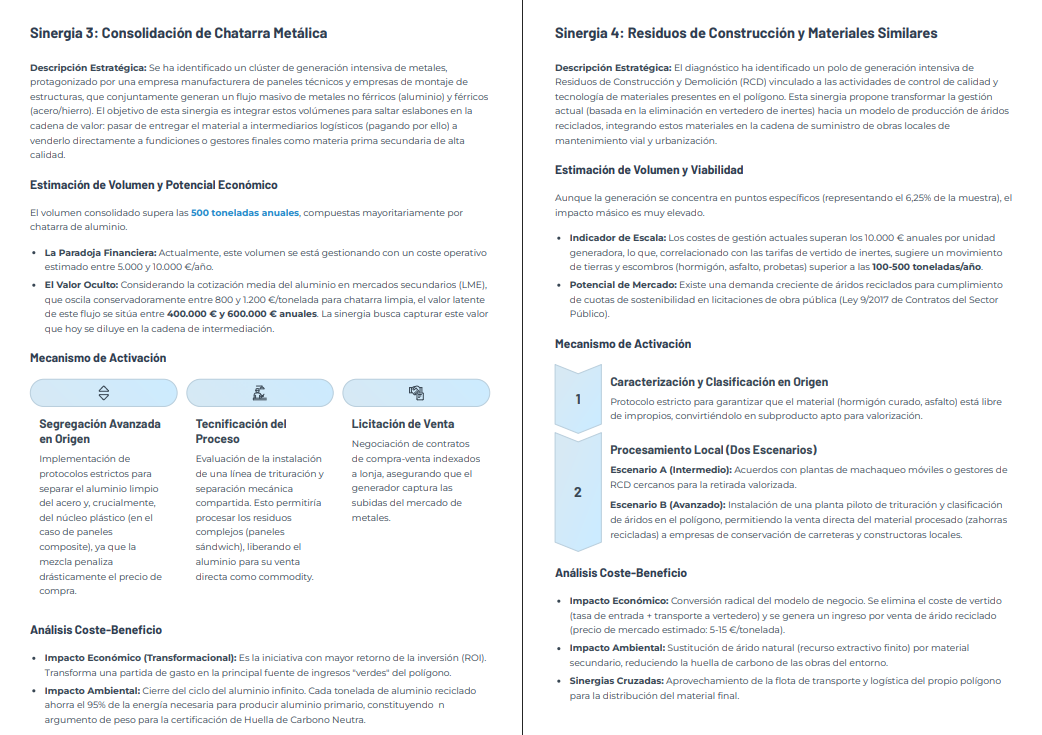 - Identificar oportunidades de simbiosis industrial y economía circular entre empresas del área empresarial, favoreciendo la recogida conjunta de determinados residuos, la valorización de materiales con alto valor (como la chatarra metálica) y la creación de puntos de recogida comunes para flujos específicos (RAEE, pilas, aceites, etc.).