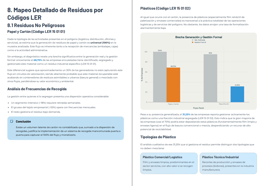 - Analizar los principales flujos de residuos del polígono (papel y cartón, plásticos, madera, metales, residuos orgánicos, RAEE, pilas y baterías, aceites y disolventes, residuos de construcción, etc.), cuantificando su generación anual y su potencial de valorización.